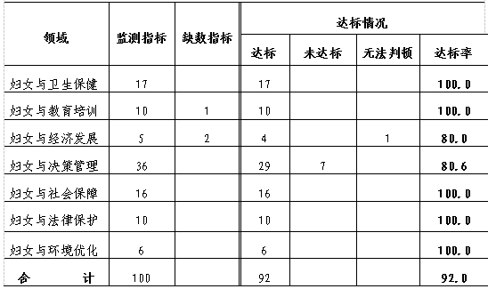 截至2020年底,《规划》中涉及的妇女与卫生保健、妇女与教育培训、妇女与经济发展、妇女与决策管理、妇女与社会保障、妇女与法律保护、妇女与环境优化等七大领域中的100项主要监测指标中,达标92项,总达标率为92.0%;7项未达标,占目标总数的7.0%;1项指标是七人普查数据,暂无数据无法判断。