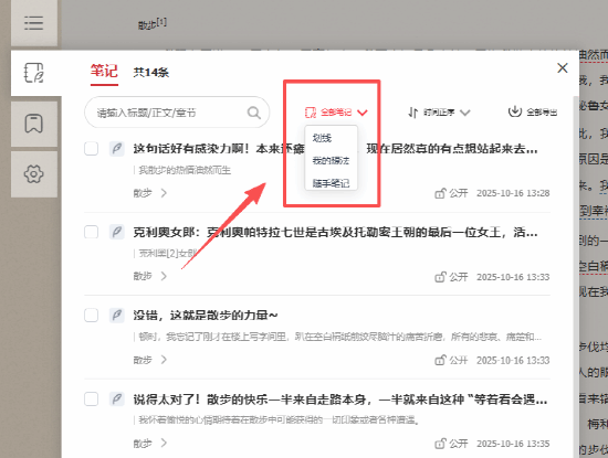在 “笔记中心” 一键切换 “划线 / 我的想法 / 随手笔记”,不同类型一目了然;