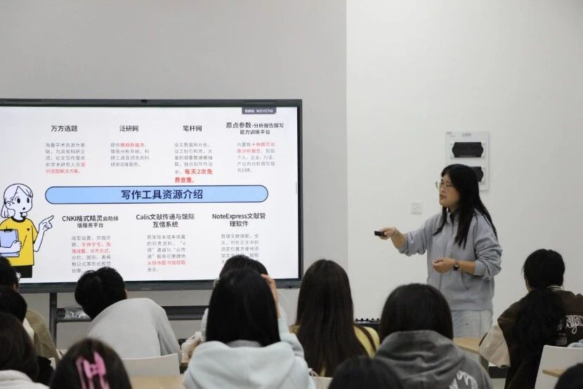 内容涵盖助力考研深造的“研图学堂”;提升外语能力的“新东方多媒体学习库”;服务于医学、计算机、设计等专业的万方医学网、中华医学期刊全文数据库、51CTO学院、翼狐设计学习资源库等定制书库。王老师还重点推荐了万方选题、CNKI的AI检索功能和NoteExpress等能在论文开题、格式排版、文献管理等方面显著提升效率的实用工具,让同学们感受到了数字化学术支持的强大魅力。
