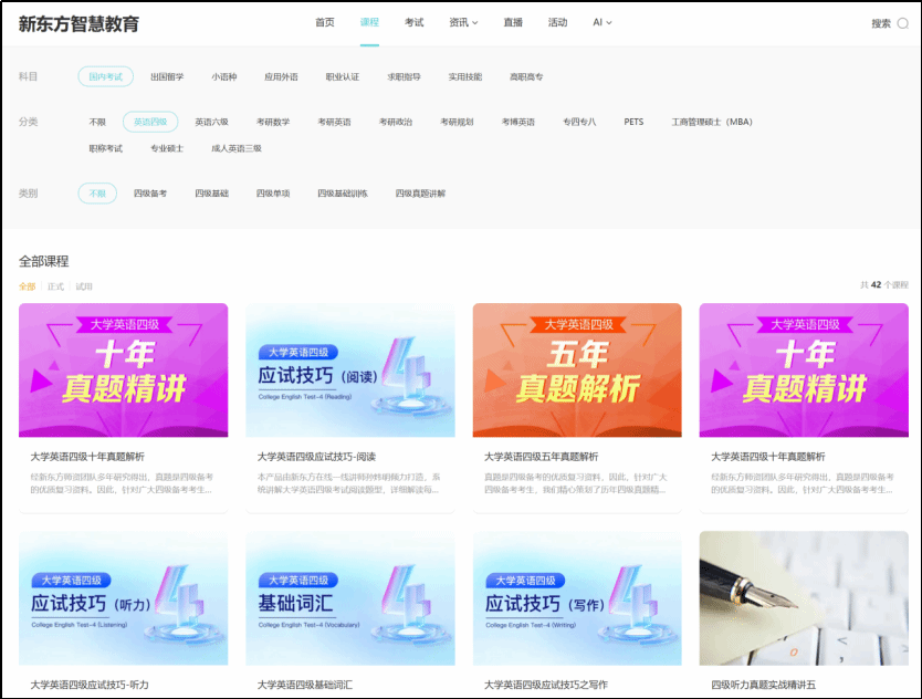 新东方多媒体学习库针对四六级考试特点,打造覆盖「基础夯实、应试技巧、真题精讲」三大维度的核心课程体系,由新东方一线资深讲师研发授课,确保内容专业性与实用性,助力考生系统性突破备考瓶颈。