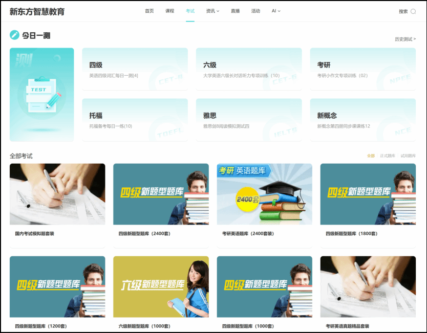新东方多媒体学习库立足考生全周期备考,构建「核心课程 + 考试中心 + 互动直播 + 资讯板块 + AI 应用」一站式备考体系,以专业化资源、智能化工具与实时化信息,为考生提供从基础巩固到实战冲刺的全流程支持,助力大家科学备考、从容应考。