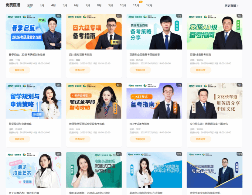 直播讲师均为新东方资深教师,兼具教学与命题研究经验;所有直播 3 小时内生成高清回放,支持进度定位与倍速播放,方便考生反复学习重点。
