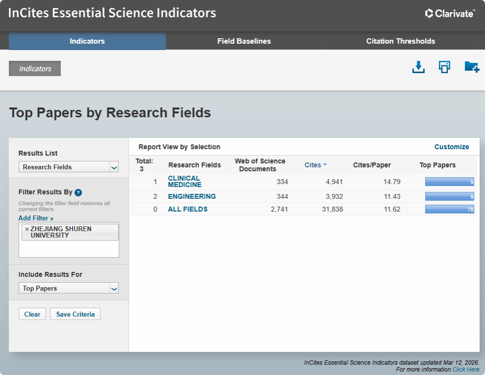 根据科睿唯安2026年3月12日ESI数据库公布的最新数据显示,我校工程学(Engineering)(论文数:344,被引频次:3932)比预测提前一期进入ESI全球前1%机构排名,成为我校第二个跻身ESI排名的学科(我校排名:2959/总机构数:2982)。目前我校已有临床医学(我校排名:6708/总机构数:7091)和工程学两个ESI学科进入全球前1%排名。