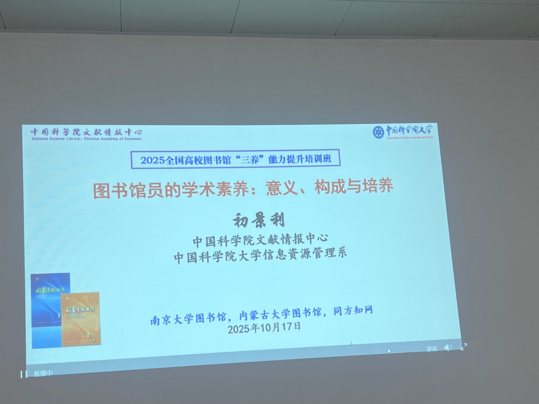为顺应新时代图书馆转型发展需求,全面提升馆员队伍的专业化水平与服务能力,10月13日至24日,我馆积极组织馆员参加了由南京大学图书馆、中国知网及全国29个省(区、市)图工委联合举办的“2025全国高校图书馆‘三养’能力提升培训班”线上讲座,并取得了良好成效。