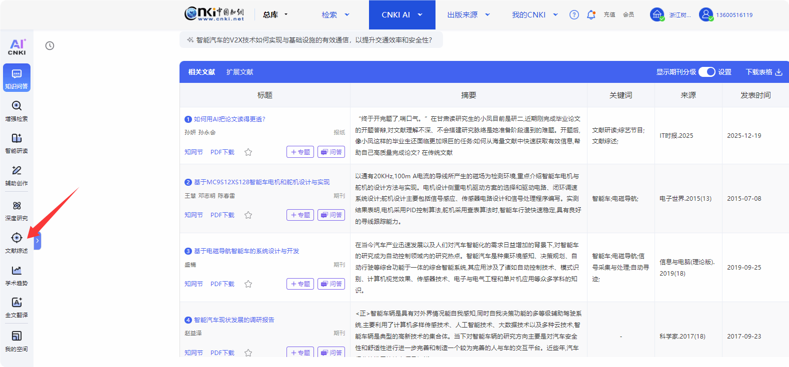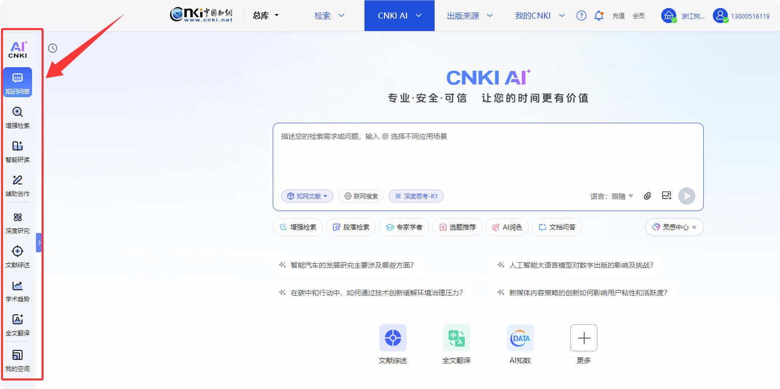 (5)进入“CNKI AI”页面,点击左侧栏相关功能,进行知识问答、文献综述、辅助创作等