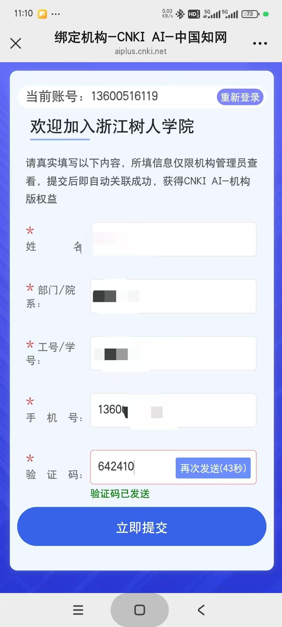 登录完成后,会在右上角显示“浙江树人学院”的机构账号和个人手机账号登录状态