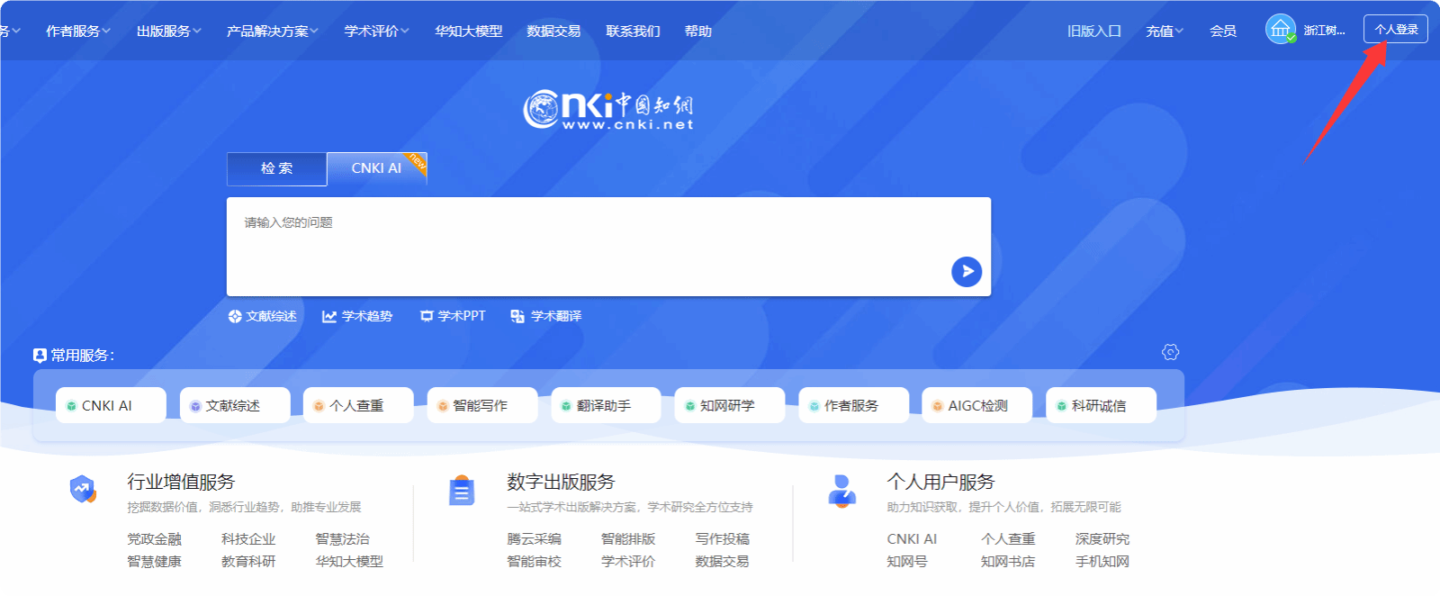 (3)进入cnki首页,点击右上角“个人登录”,登录上述第一步中绑定机构用户用的个人账号