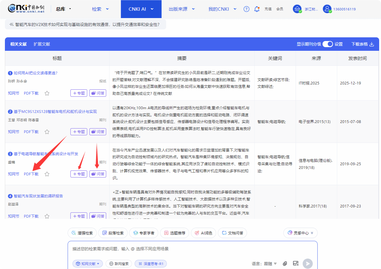 可以用自然语言向“CNKI AI”提各种学术问题,CNKI AI进行深度思考后,给出答案,并提供参考文献,可对参考文献进行PDF下载、加入专题,或专门对该文进行提问