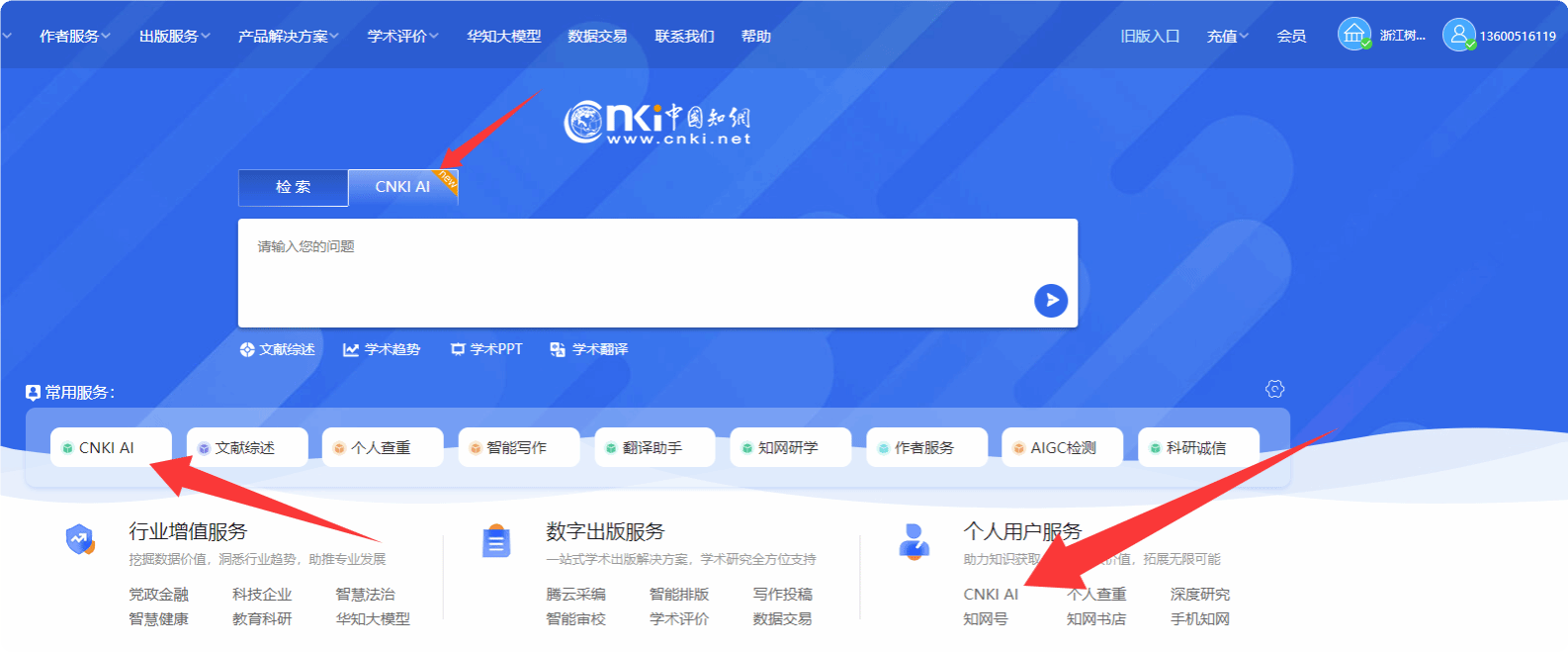 (4)点击进入“CNKI AI”标签,或检索框下面“常用服务”的“CNKI AI”链接