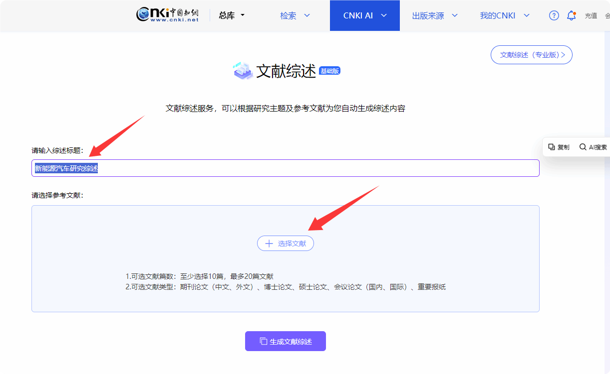根据关键词进行检索,然后选择文献,最多20篇,点击“已选好文献”