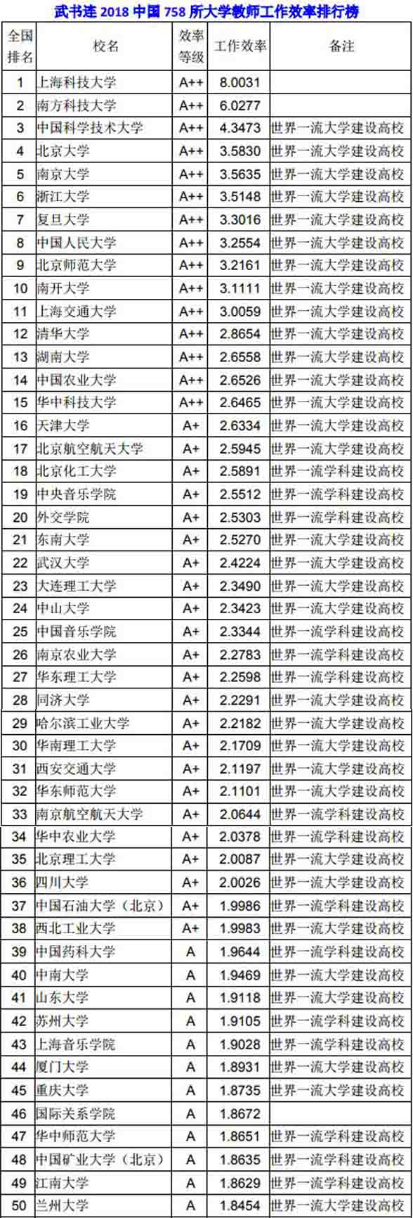 在武书连2018教师工作效率排行榜中,大多数双一流大学教师有很高的工作效率,少数双一流大学教师工作效率有待提高。普通高校41所世界一流大学建设高校,有29所进入教师工作效率前41名。普通高校134所双一流大学中,有98所进入教师工作效率前134名。值得一提的是,有2所非双一流大学进入教师工作效率前41名,且列中国大学教师工作效率前两名,依次是:上海科技大学、南方科技大学。