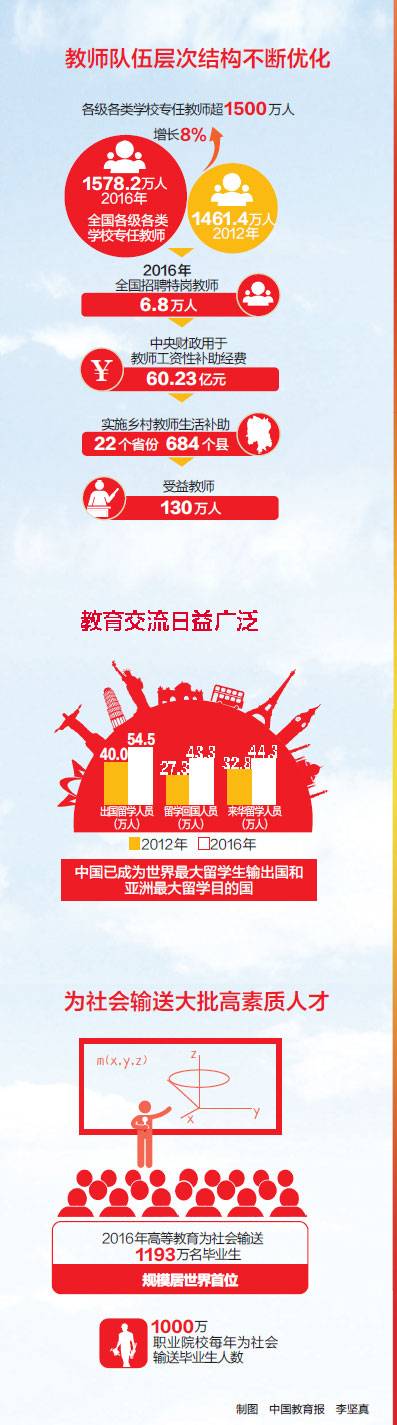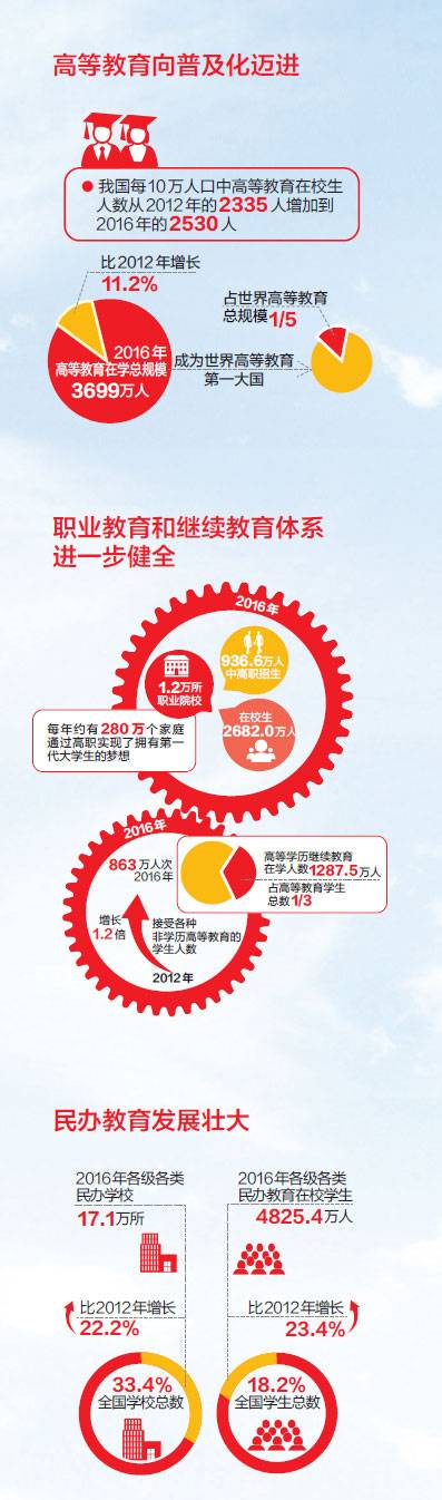 人民群众享有更多教育获得感——学生资助体系全覆盖,特殊教育发展水平显著提升,义务教育阶段进城务工人员随迁子女八成就读公办校,营养改善计划成效明显,留守儿童关爱服务体系建立,全面改善贫困地区薄弱校,实施中西部高等教育振兴计划,让更多农村孩子上重点大学;