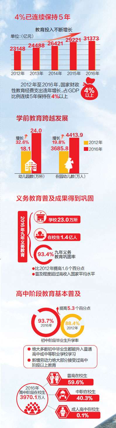 持续加大投入优先发展教育——4%已连续保持5年,各级教育经费逐年增长,教师队伍层次结构不断优化,信息化支撑引领教育发展;