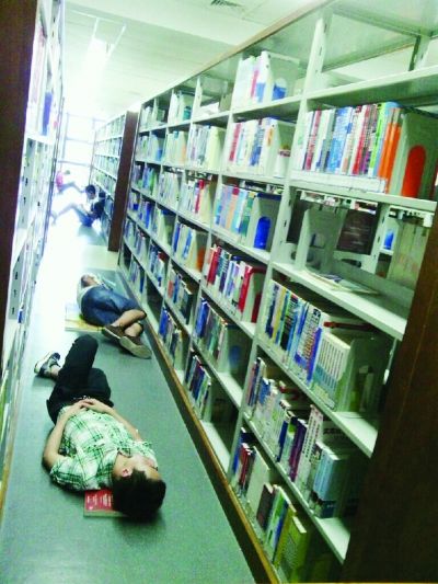 今夏首轮高温来袭,南京已连续两天蒸桑拿了,伤不起的大学生们已找到了最好的避暑胜地,那就是图书馆了。昨天,人人网上一张学生在图书馆席地而睡的照片引起了网友强烈共鸣,短短几日,转发上万。
