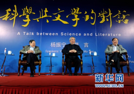 在谈到文学和科学的关系时,莫言说,文学创作和科学有很多不同。文学关注人,科学关注自然界,文学家关注人类情感,科学家关注物质原理。严格地说,作家的创作也不是无中生有,很多作品都是经过现实人物想象加工的综合,但又不能和任何人对上号,这是文学比物理学、化学更自由的地方。杨振宁则认为,科学里更多是去发现,而文学里更多是去发明,但两者都需要“妙悟”和“想象力”。