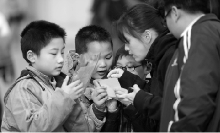 在门外等候的人群里,一位姓王妈妈的手里拿着一本数学“聪明题”,记者翻看了一下,里面写得满满的,题目都做过了。王妈妈说:“孩子早上6点钟起床,还特意花了半小时,快速翻了翻,我怕他路上还要看,就给带过来了。”她说,儿子今年读五年级,成绩在班里前几名。