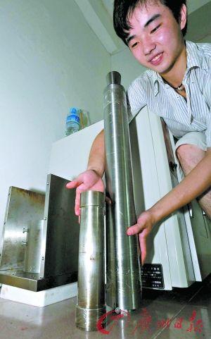 火箭小组展示之前试验失败的固体火箭发动机(左)和现在新研制的固体火箭发动机。 记者黎旭阳 摄