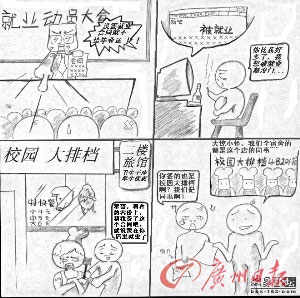 记者随后采访到了漫画作者应届毕业生丘俊航。丘俊航说,之所以会采用漫画的形式来表达自己的思想,主要是觉得漫画比文字更能表现出自己心中的感情。他说,漫画的内容都是自己亲身经历,所见所闻。虽然加入了一些夸张的艺术手法,但还是以坚持事实为原则。