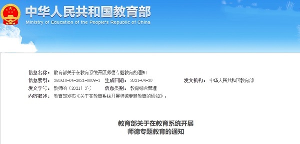 央广网北京5月12日消息(记者张喆)近日,教育部印发《关于在教育系统开展师德专题教育的通知》(以下简称《通知》),明确师德专题教育将贯穿2021年全年,引导广大教师坚定理想信念、厚植爱国情怀、涵养高尚师德。