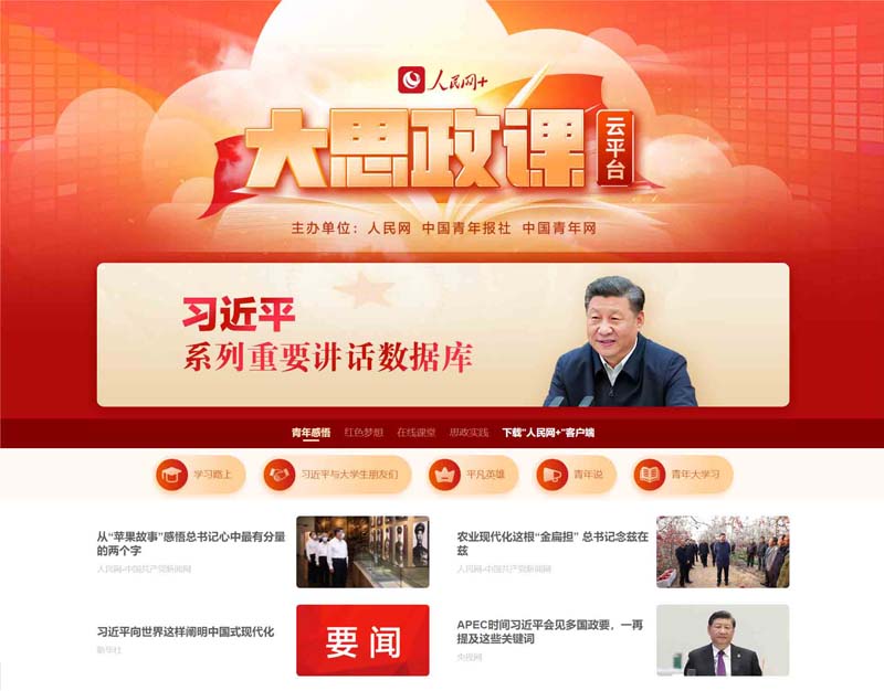 人民网“大思政课”云平台是人民网整合自身思政领域资源,集纳全网优质思政教育内容,面向全国青少年群体打造的思政工作平台,设置习近平系列重要讲话数据库、青年感悟、红色梦想、在线课堂、思政实践等板块,涵盖线上与线下、理论与实践、展览与培训等多形态的内容、产品与服务。云平台以“人民网+”客户端为主阵地,并可灵活嵌入各类智能终端,实现最广泛触达青少年群体。