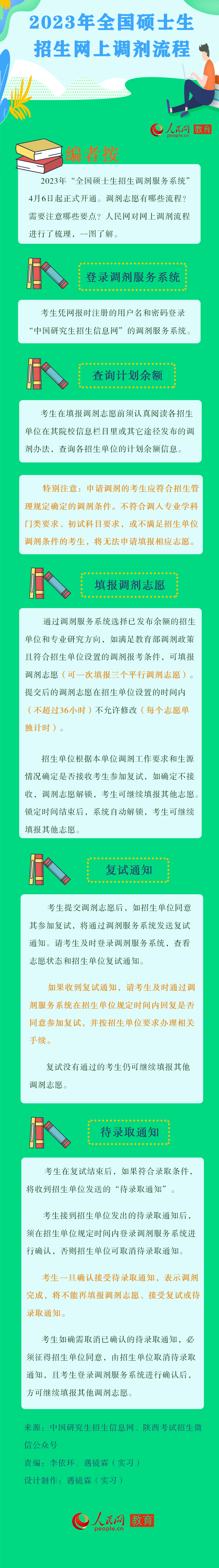 按照教育部统一安排,2023年硕士生招生“调剂服务系统”今日(4月6日)起正式开通。期间,有调剂意愿的考生,可凭网报时注册的用户名和密码登录调剂系统申请调剂。人民网对相关调剂流程及注意事项进行了梳理,以供考生参考。(李依环、实习生遇镜霖)