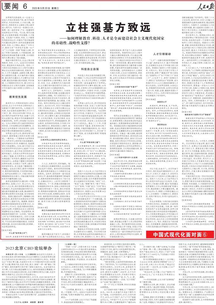 推进中国式现代化,长远之策必须靠教育、科技、人才。这是历史发展的结论,更是面向未来的必然。党的二十大报告站在我国社会主义现代化建设事业长远发展的战略高度,把教育、科技、人才作为基础性、战略性支撑,摆在极为重要的位置,对实施科教兴国战略、强化现代化建设人才支撑作出专章部署,提出加快建设教育强国、科技强国、人才强国的目标任务,着力夯实全面建设社会主义现代化国家、全面推进中华民族伟大复兴的智力支持和人才保障。