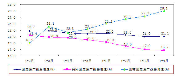 今年以来,我省民间固定资产投资高开低走,增速呈逐月回落态势,与固定资产投资、国有投资的增幅差距逐月扩大。前三季度,全省民间固定资产投资9014亿元,比上年同期增长16.7%,与固定资产投资增幅差从上半年的2.7个百分点扩大到前三季度的4.4个百分点。而同期国有投资增速却逐月攀升,增速从上半年的25.1%上升到前三季度的29.1%;民间投资与国有投资的增幅差从上半年的5.8个百分点拉大到目前的12.4个百分点(如下图)