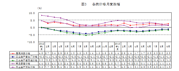 (1)居民消费价格温和上涨。前三季度,居民消费价格总水平同比上涨2.1%,涨幅略高于上半年0.2个百分点,比全国同期低0.4个百分点,9月环比上涨0.7%。八大类消费品及服务项目价格六涨一平一跌,衣着、食品、居住、家庭设备用品及维修服务、娱乐教育文化用品及服务、医疗保健和个人用品类价格分别上涨3.7%、3%、2.6%、2.4%、2.1%、0.1%;烟酒及用品价格与去年同期持平;交通和通信价格下降0.5%。