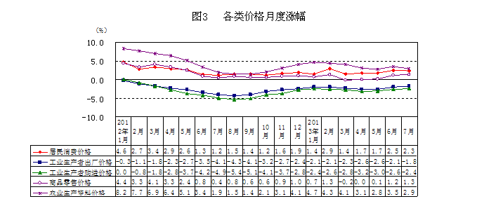 1-7月,全省居民消费价格总水平比去年同期上涨2%,涨幅比上半年提高0.1个百分点,比全国同期低0.4个百分点;其中,7月份,居民消费价格上涨2.3%,涨幅比6月回落0.2个百分点,比全国低0.4个百分点,环比上涨0.3%。据测算,7月份同比涨幅中的翘尾因素比6月份减少0.5个百分点,新涨价因素比6月份增加0.3个百分点,翘尾因素的减少是当月CPI回落的主要原因。1-7月,8大类消费品及服务项目价格6涨1平1跌,衣着、居住、食品、家庭设备用品及维修服务、娱乐教育文化用品及服务、烟酒及用品类价格分别上涨4.4%、2.7%、2.6%、2.5%、2%、0.1%;医疗保健和个人用品价格与上半年持平,交通和通信价格下降0.7%。