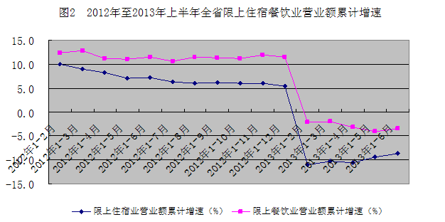 1.限上住宿餐饮业营业额继续回落。各地认真贯彻落实中央“八项规定”和省委“六项禁令”,公务消费明显减少,短期内对消费增长产生较大影响,尤其对高档住宿餐饮消费影响更为明显,导致今年以来住宿餐饮业营业额持续下滑,其中住宿业降幅超过餐饮业。1-2月全省限上住宿餐饮业营业额分别同比下降6.2%,为近四年来同期首次出现负增长,1-3月、1-4月、1-5月分别同比下降5.7%、6.6%和6.5%,上半年我省限上住宿餐饮业营业额同比下降5.8%。限上住宿业营业额同比下降8.6%,上年同期增速为7.1%(详见图2);从住宿星级分组看,全省五星级饭店营业额同比下降13.1%,四星级饭店营业额同比下降10.0%;限上餐饮业营业额同比下降3.5%,上年同期增速为11.4%;从餐饮类别看,正餐服务营业额同比下降7.2%,快餐服务营业额同比下降13.4%,饮料及冷饮服务营业额同比下降20.4%。