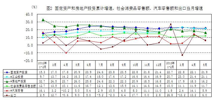 居住类商品和金银珠宝销售情况较好,汽车销售增速逐步回升。1-5月,限额以上贸易企业的建材装潢、五金电料、家具、家用电器类零售额同比分别增长57.1%、43.5%、23.8%和18.6%;金银珠宝继续保持旺销,同比增长42%;服装、日用品、通讯器材、中西药品类零售额继续保持稳定增长,分别为增长13%、12.1%、11.5%、13.3%;汽车类零售额1000.3亿元,同比增长5.8%,增速比1-4月回升0.8个百分点,对社会消费品零售总额的增长贡献率从去年同期的7.9%回升为9.6%,其中,5月份汽车销售215.6亿元,为今年来的次高点(1月236.8亿元)。