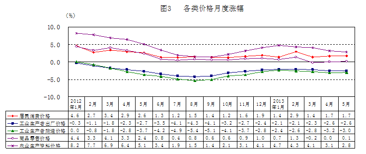 1-5月,工业生产者出厂价格和购进价格比去年同期分别下降2.3%和2.8%,工业生产者出厂价格降幅与1-4月持平,购进价格比1-4月扩大0.1个百分点。其中,5月份,工业生产者出厂价格和购进价格分别下降2.6%和3.0%,出厂价格降幅与4月持平,购进价格降幅比4月缩小0.2个百分点,环比分别下降0.3%和0.4%。