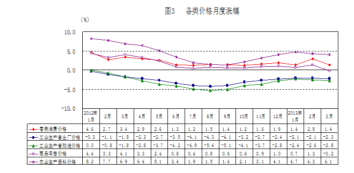 从内需看,一是消费和居民收支增速放缓。一季度,社会消费品零售总额同比名义增速(10.3%)低于去年同期和全年2.9和3.2个百分点,为2004年以来(“非典”影响消除后)的新低,2月仅增长8.4%。城镇、农村居民人均收入水平虽居全国前列,但名义增速(8.4%和9.4%)分别低于全国平均0.9和2.8个百分点,居各省市区27和29位;实际增速(6.4%和7.5%)低于全国0.3和1.8个百分点,也低于我省同期GDP增速。城镇居民人均消费支出实际增长6.3%,同比回落5.5个百分点。高端消费热点正在降温,新的消费热点形成尚需时日。一季度汽车销售增速为历史新低,汽车类零售额575亿元,增长1.8%,增速同比回落9.4个百分点,为近3年来季度增速的新低,对社会消费品零售总额的增长贡献率从去年同期的14.9%下降到3.2%;与此相关的石油制品零售额增长9%,同比回落13.1个百分点。高档餐饮、住宿业转型压力加大。一季度,限额以上企业(单位)餐饮业零售额86.6亿元,同比下降2.2%;住宿业零售额39.4亿元,下降14.6%,而去年同期是分别增长11.9%和9.2%。汽车、石油制品和限上住宿餐饮类消费占社会消费品零售总额的比重从去年同期的30.3%下降到28.2%。用于礼品的部分名优新特农产品和生猪销售及价格下滑,对农民增收和消费增长带来新的压力。中高档礼品茶、甲鱼等价格明显下降;生猪出栏价格持续走低,据省物价局监测,猪粮比价由1月中旬的6.68∶1下跌至4月15-19日的4.92∶1,连续9周处于盈亏平衡点(6∶1)以下,连续两周处于生猪红色预警即价格重度下跌区域。H7N9禽流感对家禽业、餐饮业和旅游业等影响逐步显现,也将对消费的平稳增长带来一定压力。二是进口和工业生产者价格下降反映企业生产需求不够旺。一季度,外贸进口同比下降6.8%,而去年同期为增长3.5%。机电产品、高新技术产品、铁矿砂、铜材、钢材、原木、棉花等原材料进口降幅明显,分别下降14%、18.1%、11.7%、48.3%、25.1%、16%、43%,乙二醇和对苯二甲酸等化工原料分别下降12.2%和56.6%。工业生产者出厂价格和购进价格降幅分别比全国大0.5和0.7个百分点,降幅均比1-2月扩大0.1个百分点。从分月指数看,去年9月份以来降幅连续收窄后今年又重现扩大(见附图3),3月降幅分别比1月扩大0.2和0.4个百分点,环比均下降0.2%。