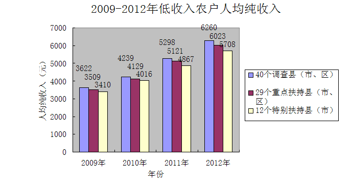 2.低收入农户普遍增收。监测调查显示,2010年,40个调查县(市、区)中有一半县(市、区)的低收入农户人均纯收入达到4000元以上;2011年,40个调查县(市、区)低收入农户人均纯收入全部超过4000元,其中人均纯收入超过5000元的有19个;到2012年,40个调查县(市、区)低收入农户人均纯收入全部超过5000元,其中人均纯收入在5000-6000元之间的有22个,6000-7000元之间的有11个,7000-8000元之间的有5个,8000元以上的有2个。