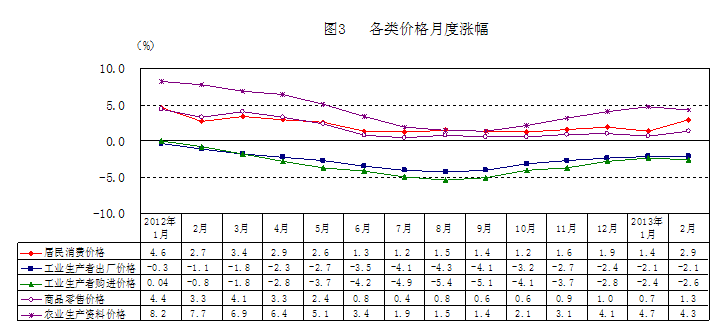 1-2月,八大类消费品及服务项目价格七涨一跌,衣着、食品、居住、家庭设备用品及维修服务、娱乐教育文化用品及服务、烟酒及用品、交通和通信价格类价格分别上涨4.5%、3%、2.7%、2.5%、1.3%、0.5%、0.1%;医疗保健和个人用品价格下降0.2%。其中,受春节因素影响,2月份食品类价格同比涨幅比1月份提高2.9个百分点,环比上涨3.2%,所调查的16种食品价格有11种食品出现不同程度的环比上涨。