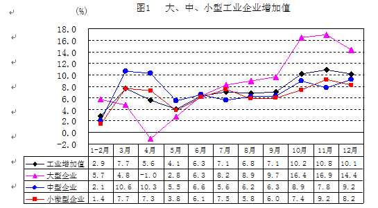 2.行业发展整体向好,但分化明显。2012年,规模以上工业的38个大类行业中,增加值增速在10%以上、5-10%、5%以下的行业分别有11、14和13个,其中,负增长的行业由前三季度的6个减少到2个。医药、有色金属冶炼、化学纤维、汽车和化学原料增长较快,增加值分别增长20.2%、15.8%、15.7%、15.4%和12.0%,这5个行业增加值占规模以上工业的20.3%,拉动规模以上工业增长2.8个百分点。而皮革、非金属制品、服装和石油加工增加值增速则分别为0.1%、0.1%、-0.8%和-3.7%。