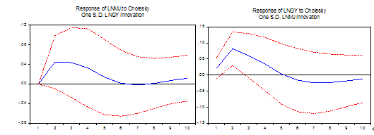 本文选用Granger因果关系检验来检验变量间的因果关系。从表中各个变量Granger因果关系检验结果可以看出,在10%的显著水平下,三个变量DLNGDP、DLNGY和DLNMJ绝大部分通过了Granger因果关系检验。具体分析如下: