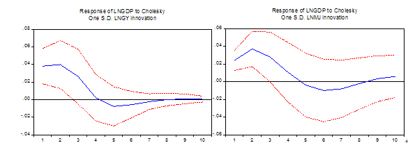 (2)各变量对DLNGY方差贡献情况分析。在各变量对DLNGY方差贡献中,国有投资自身变动冲击占了主要部分,各期基本在48.8%以上,在第5期达到稳态。来自GDP变动冲击在第6期维持在31.3%左右,来自民间投资变动冲击则相对较小,在第6期维持在19.8%的稳态水平。来自GDP和民间投资变动冲击相比,国有投资更容易受GDP变化的影响。