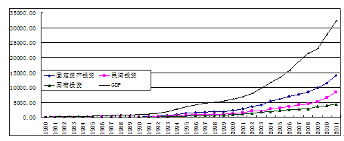 改革开放以来,浙江固定资产投资、国有投资和民间投资绝对规模呈现递增发展态势。1980-1992年呈现一个缓慢递增的过程,1992年以后呈现加速发展的态势。2011年,浙江生产总值32319亿元,1979-2011年年均增长12.8%;固定资产投资14077亿元,年均增长21.7%。其中,民间投资、国有投资分别为8513亿元和4449亿元,占固定资产投资的比重分别为60.5%和31.6%,2004-2011年年均增长分别为19.9%和12.1%。