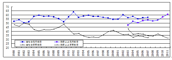 图2 1980-2011年浙江国有投资和民间投资占比变化情况