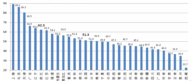 图3 2011年全国各直辖市、省、自治区城市化率(%)