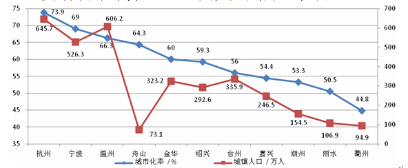 图2 2011年浙江省各地市城市化水平及城镇人口数量