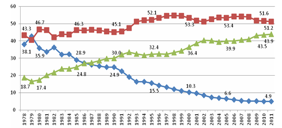 图5 1978-2011年浙江省各产业产值占GDP的比重(%)