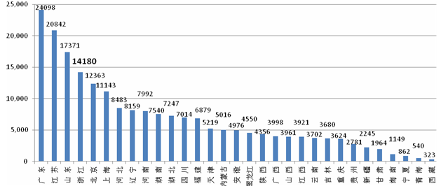 2011年,浙江省服务业增加值1.42万亿元,位居全国第四,仅次于广东、江苏和山东省(见图6)。