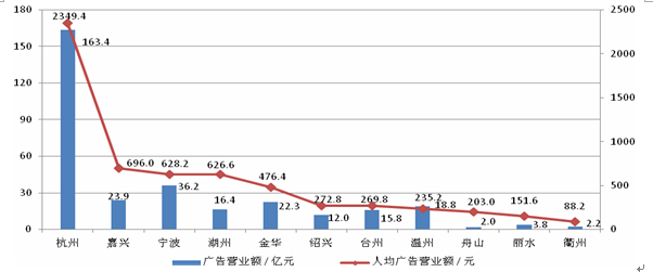 图2 2011年浙江省各地市广告营业额及人均广告营业额