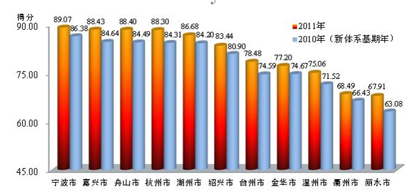宁波市 | 89.07 | 1 | 86.38 | 湖州市 | 86.68 | 5 | 84.20 | 温州市 | 75.06 | 9 | 71.52 |