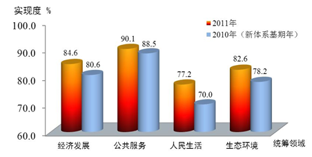 评价显示,2011年,经济发展、公共服务、人民生活、生态环境四大领域统筹水平全面提升,得分分别为23.69分、23.42分、20.07分、16.51分;实现度分别为84.6%、90.1%、77.2%、82.6%,比2010年分别提高了4.0、1.6、7.2、4.4个百分点。领域间差距进一步缩小,实现度最高值与最低值之间差距从2010年的18.5个百分点,缩小到12.9个百分点,缩小了5.6个百分点(见图2)。