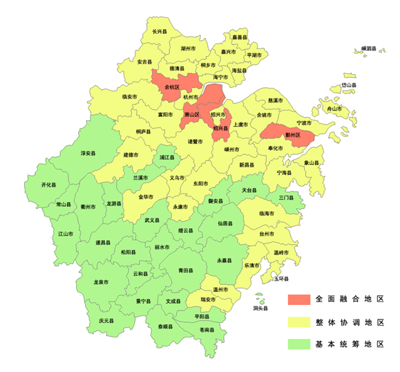 按新体系测算和新阶段划分,有26个、占42.6%的县(市)评价得分在60分以上,处于基本统筹阶段。按得分高低依次是:洞头、武义、三门、平阳、磐安、浦江、江山、云和、永嘉、龙游、仙居、天台、淳安、开化、兰溪、遂昌、苍南、景宁、泰顺、常山、文成、松阳、青田、缙云、庆元、龙泉(见图8)。