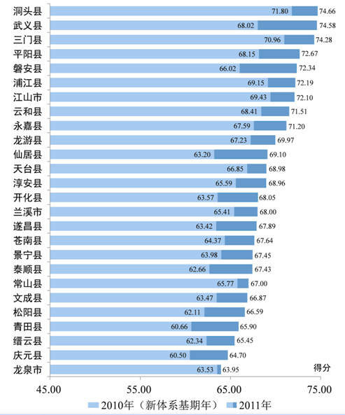 长兴县 | 85.61 | 16 | 83.33 | 武义县 | 74.58 | 37 | 68.02 | 青田县 | 65.90 | 58 | 60.66 |
