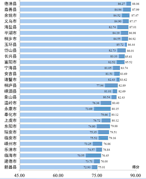 德清县 | 88.06 | 7 | 86.27 | 东阳市 | 79.88 | 28 | 74.80 | 开化县 | 68.05 | 49 | 63.57 |